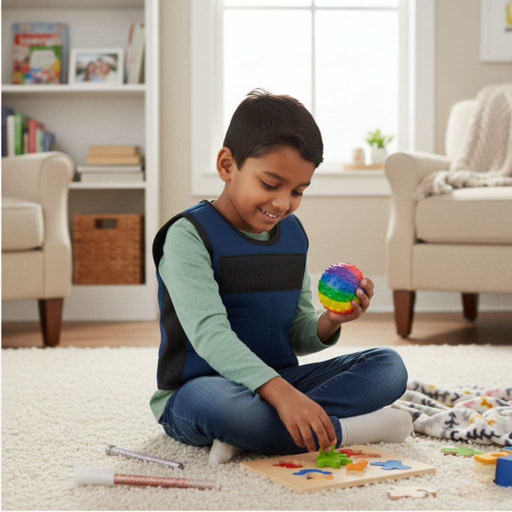 ✅ Designed for Every Environment Use it at home, school, or therapy — wherever your child needs extra sensory comfort and focus. The vest’s calming pressure helps reduce restlessness, improves attention span, and supports smoother transitions between activities.